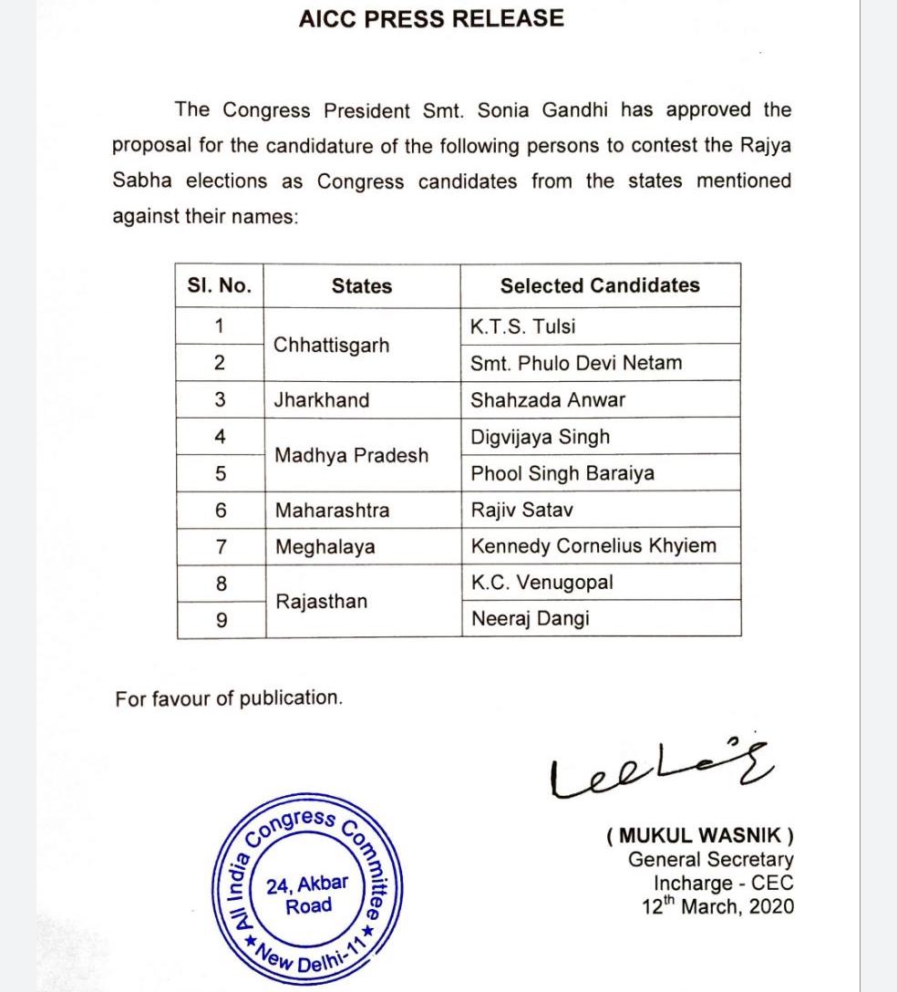 झारखंड में राज्यसभा की दूसरी सीट को लेकर कांग्रेस ने भी अपने उम्मीदवार के नाम का ऐलान कर दिया है। कांग्रेस ने झारखंड से शहज़ादा अनवर को अपना प्रत्याशी बनाया है। इसके साथ ही छत्तीसगढ़ से केटीएस तुलसी और फुलो देवी नेताम, मध्य प्रदेश से दिग्विजय सिंह और फूल सिंह बरिया, महाराष्ट्र से राजीव सतव, मेघालय से केनेडी कोरनेलियस खयिम, राजस्थान से केसी वेणुगोपाल और नीरज दांगी को उम्मीदवार बनाया है।
